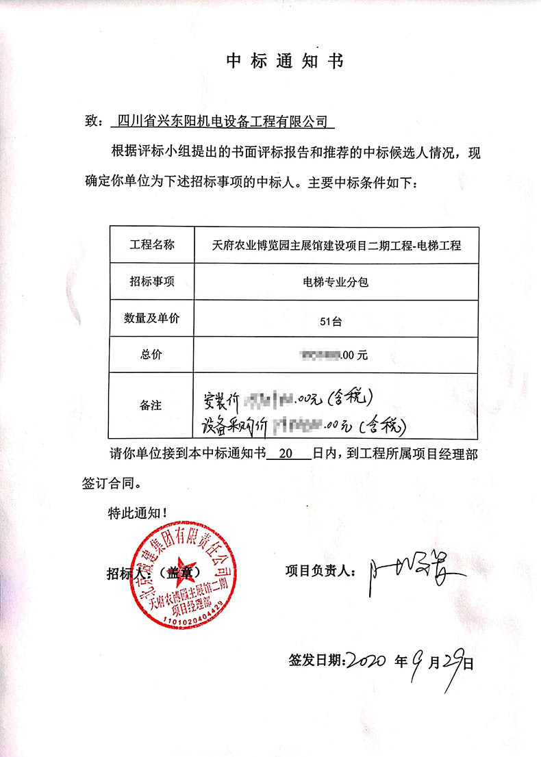 热烈祝贺我司中标天府农业博览园主展馆建设项目二期工程-电梯工程